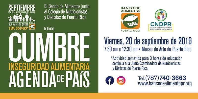 Este 20 de septiembre de 2019 el Banco de Alimentos y el Colegio de Nutricionistas y Dietistas de Puerto Rico, presentan la Cumbre: Inseguridad Alimentaria – Agenda de País. El evento tiene el objetivo de crear conciencia de la problemática de Inseguridad Alimentaria en Puerto Rico y establecer un plan de trabajo mediante estrategias de política pública a nivel local y federal, que apoye la estabilidad nutricional de esta población. Encuentra los detalles de la cumbre aquí: