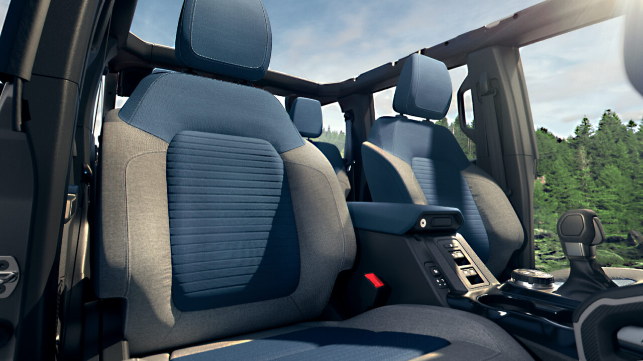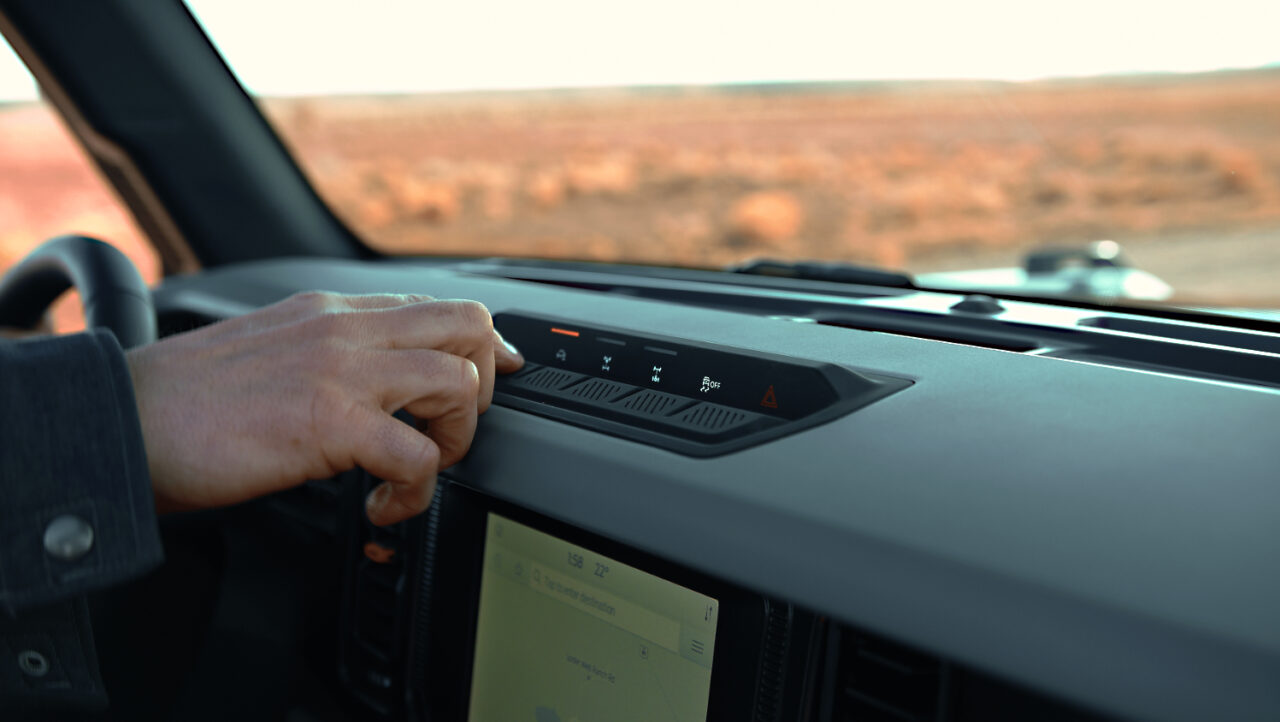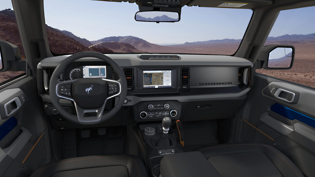 En el interior, todos los modelos Bronco están especialmente diseñados y listos para la acción. El panel de instrumentos está inspirado en el modelo de primera generación, con indicadores y controles claramente visibles e intuitivos. Los colores y materiales están inspirados en paletas naturales y equipos para exteriores. Con la funcionalidad todoterreno como enfoque primordial, los materiales son fuertes y resistentes.