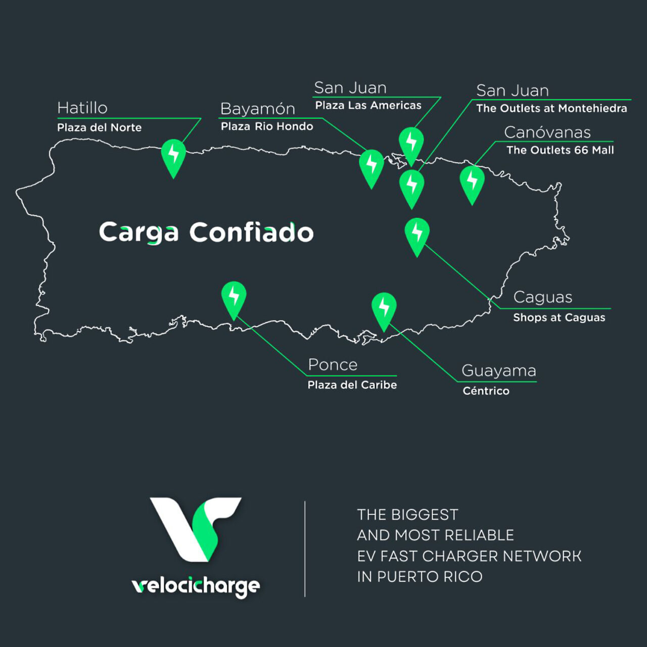 Las áreas de carga que desarrolló la empresa están alrededor de las autopistas principales del país y en localidades (centros comerciales). “Uno de los factores claves es la conveniencia de la ubicación de todas las estaciones de Velocicharge, estas se encuentran en centros comerciales populares donde los clientes se sienten a gusto, seguros y pueden completar otras tareas mientras cargan. Estudios ya nos revelan que el 45% de los clientes se toman un café, ingieren alimentos o visitan alguna tienda mientras cargan”- mencionó Juan Alvarado, Director de Mercadeo de Velocicharge.