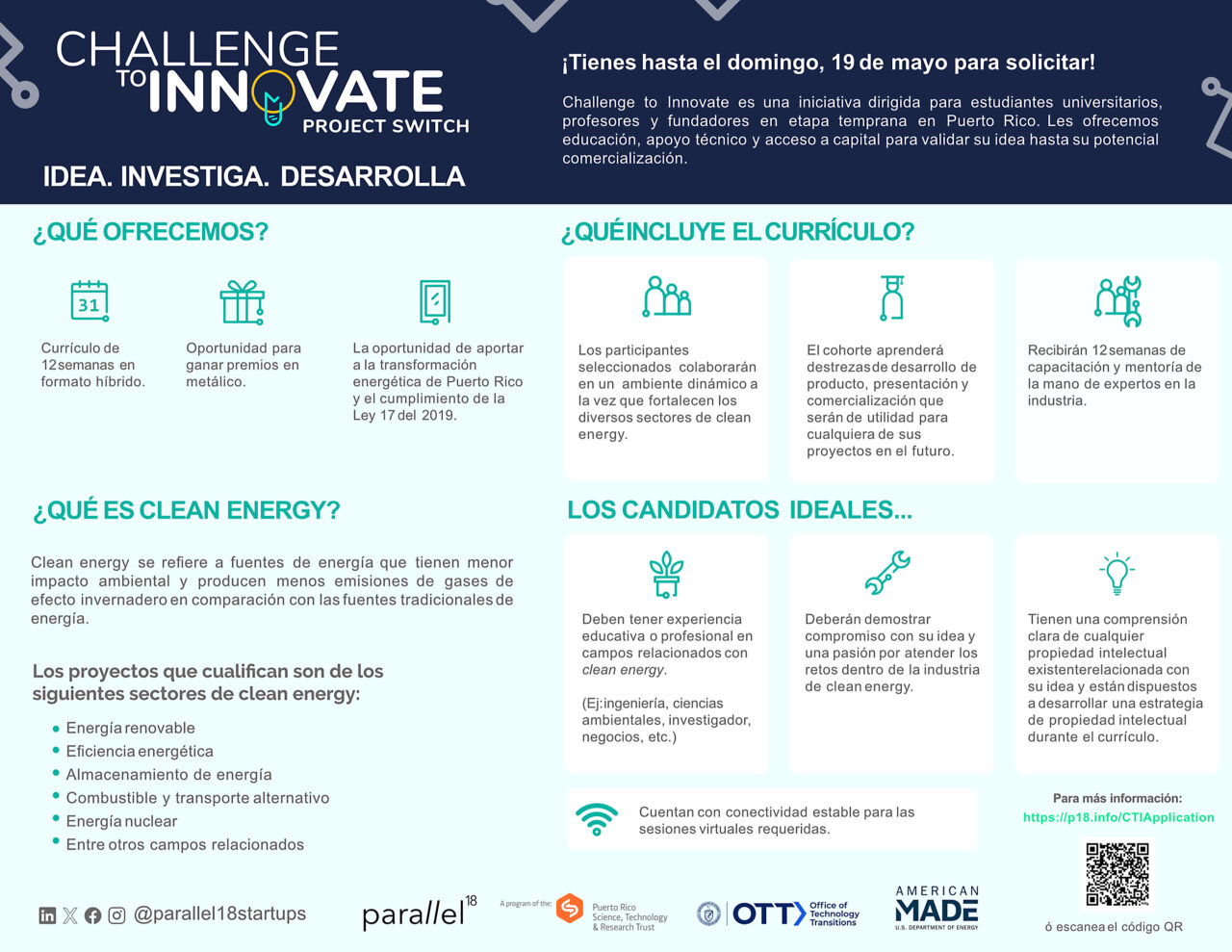 Estudiantes universitarios y docentes con proyectos o tecnologías en etapas tempranas dentro de la industria de energía limpia o clean energy en Puerto Rico tendrán la oportunidad de solicitar a la iniciativa de educación Challenge to Innovate: Project Switch, un esfuerzo del programa parallel18 perteneciente al pilar de emprendimiento del Fideicomiso para Ciencia, Tecnología e Investigación de Puerto Rico (FCTIPR). El proyecto educativo surge gracias a la subvención EPIC del Departamento de Energía de los Estados Unidos mediante su Oficina de Transiciones Tecnológicas.