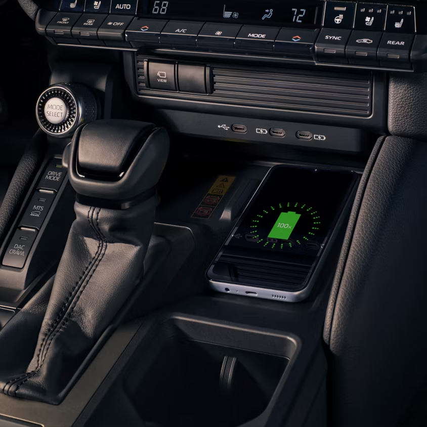 Una pantalla táctil multimedia de 8 pulgadas o de 12.3 pulgadas, muestra el sistema Audio Multimedia de Toyota, desarrollado por el equipo de Tecnologías Conectadas de Toyota con sede en Texas. El sistema es compatible con Apple CarPlay® y Android Auto™ inalámbricos y se puede combinar con un sistema de audio JBL® premium de 14 bocinas. Se ofrece carga inalámbrica Qi®, junto con múltiples puertos USB-C y un inversor de CA de 2400 vatios en el área de carga. El panel de instrumentos digital de 12.3 pulgadas disponible ofrece estilos y widgets personalizables.