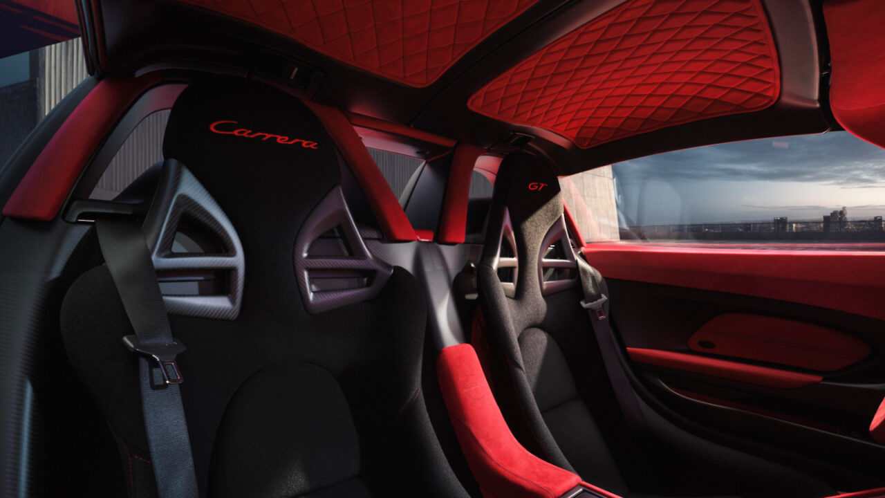 El habitáculo del Carrera GT también lleva la firma de Gómez. A petición suya, los expertos en guarnicionería de Porsche han tapizado muchas superficies con Alcantara en rojo Indian: el salpicadero, los paneles de las puertas, el volante y la consola central. También el maletero delantero y el juego de maletas están revestidos en este material agradable al tacto, similar al ante, en el llamativo color rojo.