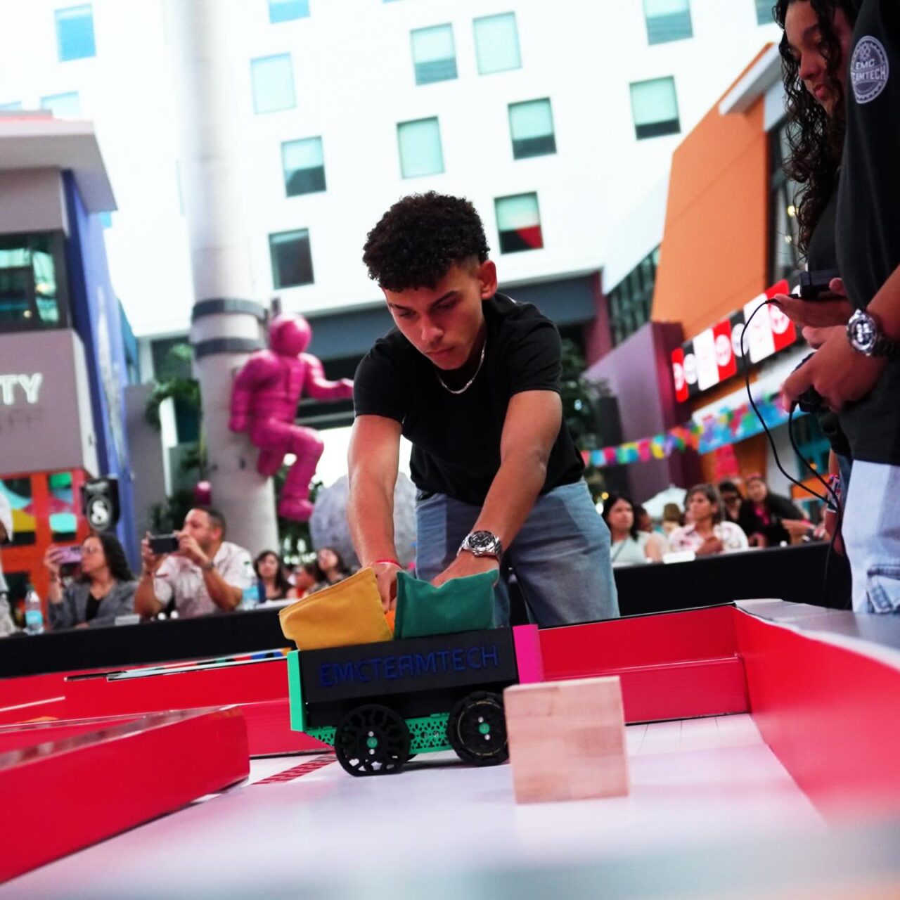 Los jóvenes participantes, de distintas áreas de Puerto Rico, tuvieron la oportunidad de poner los vehículos a prueba en dos grandes pistas ubicadas en Popular Plaza de DISTRITO T-Mobile. En los distintos circuitos, los modelos tuvieron que enfrentar diversos retos. Además de su creatividad en diseño y capacidad tecnológica, los estudiantes tuvieron que mostrar su creatividad poniéndole nombre a su modelo y creando una frase para mercadearlo.